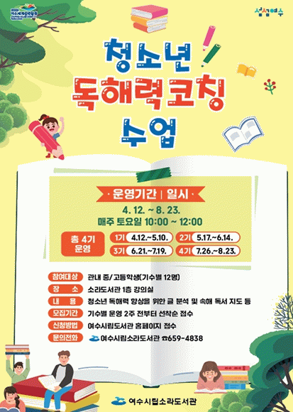 참여를 희망하는 학생은 기수 운영 2주 전 여수시립도서관 누리집에서 신청하면 되며, 1기수당 12명씩 선착순 마감된다.