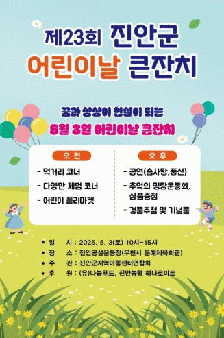 또한 명랑운동회, 풍선·버블·솜사탕 공연과 경품 추첨 이벤트도 마련돼 어린이들에게 잊지 못할 추억을 선사할 예정이다.