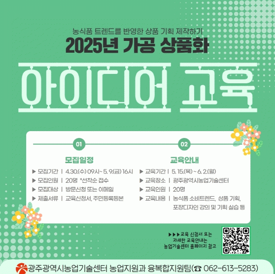 김시라 광주농업기술센터 소장은 “이번 교육을 통해 농식품 가공 분야에서 실질적인 창업 아이디어를 발굴하고, 사업화 가능성을 높일 수 있을 것으로 기대한다”며 “관심 있는 시민들의 적극적인 참여를 바란다”고 말했다.
