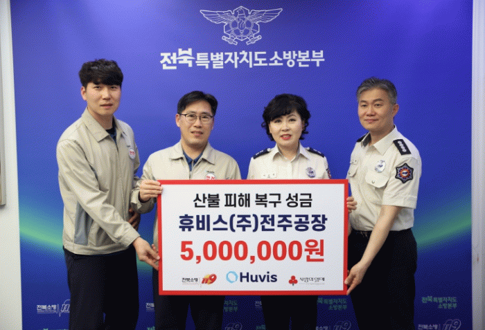이오숙 전북특별자치도소방본부장은 "휴비스 전주공장의 따뜻한 마음이 피해 주민들에게 큰 위로가 될 것"이라며 "소중한 성금이 주민들의 안정적인 생활 회복에 도움이 되도록 하겠다"고 말했다.