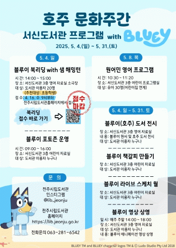 특히 5월 한 달 동안 서신도서관 3층 영어자료실에는 ‘호주’와 관련된 도서가 전시되고, △바닷속 대형스크린에 나만의 블루이 컬러링 색칠놀이 △블루이 책갈피 만들기 △블루이 영상 상영 등 즐거운 영어놀이 시간도 준비된다.
