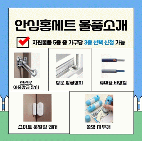 지원 장비는 ▲현관문 이중잠금장치 ▲창문 잠금장치 ▲휴대용 비상벨 ▲스마트 문 열림 센서 ▲송장 지우개 5종이며, 가구당 최대 3종까지 선택 지원된다.