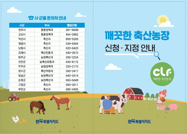 전북특별자치도는 깨끗한 축산농장 지정 확대를 위해 ▲지정농가 대상 지원사업 우대 확대(지정농가 한정사업 운영, 지원단가 상향, 대상자 선정 시 가점 부여 등) ▲신규 희망 농가 맞춤형 컨설팅 지원 ▲팜플릿 제작 및 생산자 단체·계열업체 방문 홍보를 적극 추진한다고 30일 밝혔다.