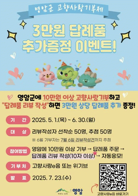 영암군은 먼저, 답례품 리뷰를 남긴 선착순 50명의 기부자에게 3만원 상당의 답례품을 추가 제공한다.