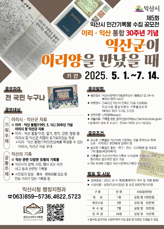 이번 공모전 주제는 '익산군이 이리양을 만났을 때'로, 통합 시기인 1995년 이전 익산군과 이리시 주민들의 삶·문화·사회상을 보여주는 민간기록물을 수집한다.