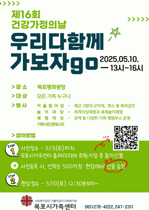 참가를 원하는 가족은 5월 3일까지 목포시가족센터 누리집을 통해 사전 접수할 수 있으며, 선착순 500가정에게는 현장에서 특별한 선물도 증정한다.
