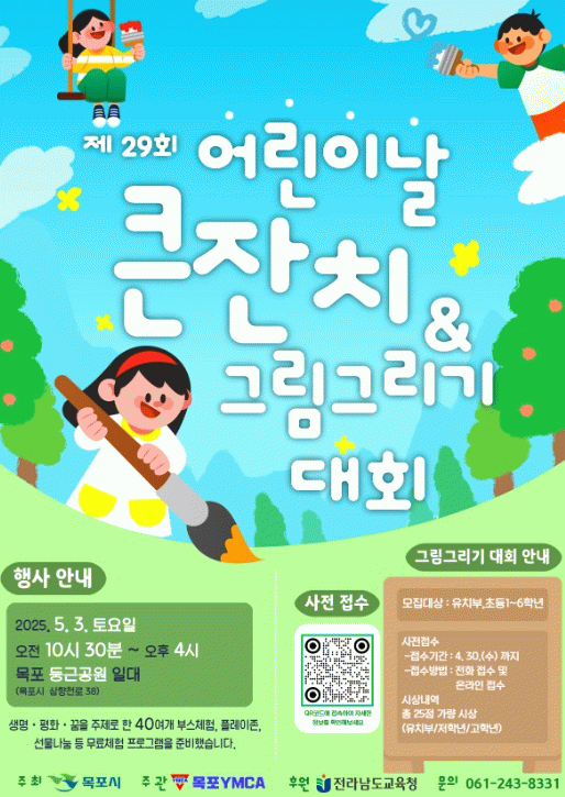 목포시가 주최하고 목포YMCA(어린이날 큰잔치 추진위원회)가 주관하는 이번 행사는 ‘어린이가 Green 어린이날’이라는 주제로, 꿈과 생명, 평화를 담아 어린이와 가족이 함께 참여하고 즐기는 시간을 마련한다.