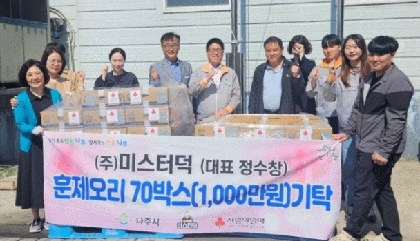 윤병태 나주시장은 “관내 소외계층을 위한 따뜻한 나눔에 동참해 주신 ㈜미스터덕 정수창 대표님께 깊이 감사 드린다”며 “기탁해 주신 물품은 관내 사회복지시설에 소중히 전달하겠다”고 말했다.