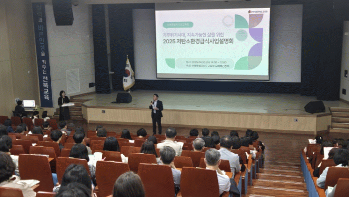 전북교육청은 30일 창조나래 시청각실에서 기후위기 시대, 지속가능한 삶을 위한 지구·생태·시민을 부제로 ‘2025 생태전환 교육급식 설명회’를 개최했다.