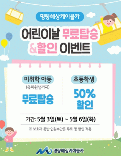 축제와 더불어 진도의 대표 관광지인 명량해상케이블카에서도 어린이날을 맞이하여 어린이 관광객들을 위한 깜짝 선물을 준비했는데, 5월 3일부터 6일까지 연휴 기간에 미취학 아동은 케이블카 무료 탑승, 초등학생은 50% 할인 이벤트를 진행한다.