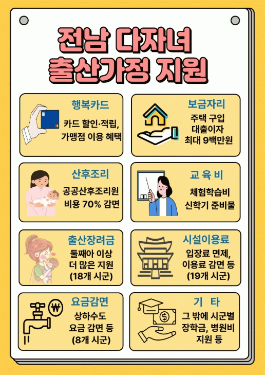이외에도 시군별로 장학금, 병원비 지원 등 다양한 다자녀 출산 장려 정책이 시행 중이다.