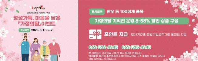 이번 ‘가정의 달 감사 기획전’은 시와 지역 생산자가 협력해 마련한 행사로 ▲정읍한우 ▲지황옥고 ▲쌍화차 ▲표고버섯 ▲잡곡세트 등 지역 대표 농특산물 100여 품목을 선보인다.