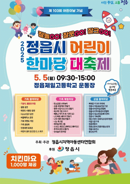 정읍시지역아동센터연합회(회장 박자희)가 주관하고 정읍시가 후원하는 이번 행사는 '잘 놀GO!, 잘 웃GO!, 잘 크GO!'라는 신나는 주제 아래, 어린이들에게 행복한 하루를 선물할 예정이다. 우천 시에는 정읍체육관에서 진행된다.