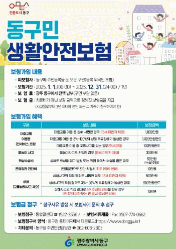 ‘동구민 생활안전보험’은 보험료 전액을 구(區)에서 부담하며, 보장 대상은 등록 외국인을 포함한 동구에 주민등록을 둔 모든 구민으로서, 별도 절차 없이 전입·전출 시 자동으로 가입·탈퇴 된다.