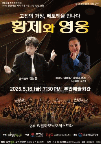 ‘황제와 영웅’은 부안군이 (재)예술경영지원센터 2025 공연예술 지역 유통지원 사업 공모에 선정돼 총 1억 5800여만원의 지원금을 확보해 선보이는 공연 중 하나로 예술경영지원센터가 주최하고 문화체육관광부가 후원해 군과 W필하모닉오케스트라가 주관하는 공연이다.