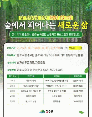 배종수 산림과장은 “이번 프로그램이 암 경험자들에게 몸과 마음을 치유할 수 있는 뜻깊은 시간이 되길 바란다”며 “앞으로도 산림자원을 활용한 다양한 치유 프로그램을 지속적으로 운영해 나가겠다”고 말했다.