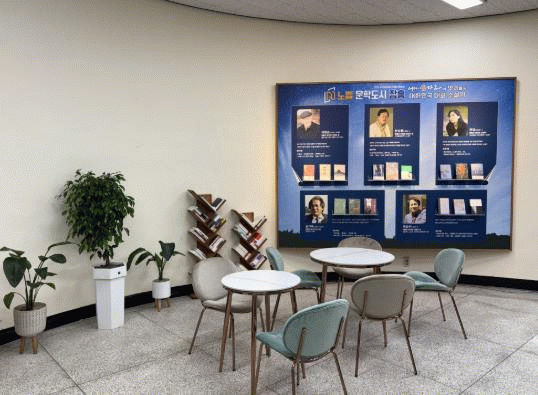 1층에서 4층으로 이어지는 내부 계단에는 장흥 대표 문학가들의 프로필과 작품을 소개하는 디자인 전시물로 꾸며졌다.