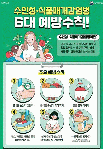 수인성‧식품매개감염병 예방을 위해서는 안전한 물과 음식물 섭취(익혀 먹기, 끓여 마시기 등), 흐르는 물에 비누로 30초 이상 손 씻기 등 감염병 예방수칙을 준수해야 한다.