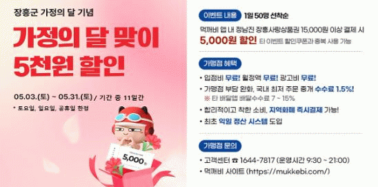 김성 장흥군수는 “소상공인의 부담 완화를 위해 공공배달앱 먹깨비 가입을 적극 홍보하여 소비자들에게 더 많은 혜택을 제공하고 가맹점을 확대할 계획이다”며 “이번 가정의 달 이벤트를 포함하여 다양한 할인 이벤트를 통해 지역 내 소비 활성화가 이루어 질 수 있도록 노력하겠다”고 말했다.
