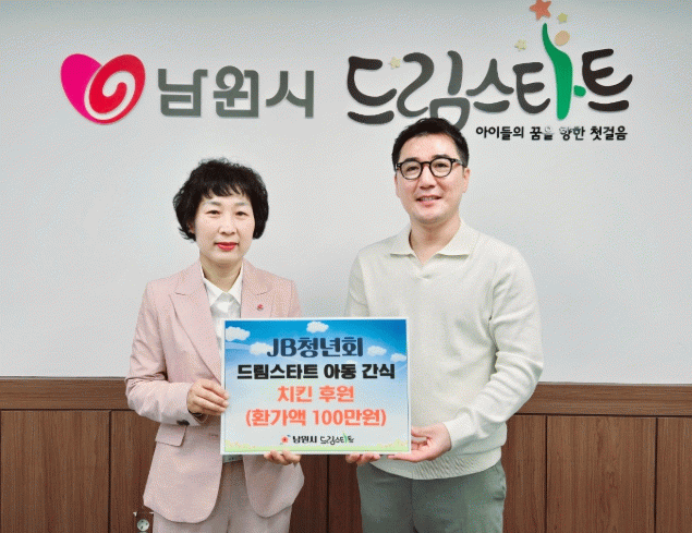JB청년회는 남원시에 거주하는 20~40대 청년 20명으로 구성된 봉사단체로 다양한 분야에서 후원사업을 펼치고 있으며, 작년에 이어 올해도 소외된 아동을 위해 환가로 100만원 상당의 치킨을 후원했다.