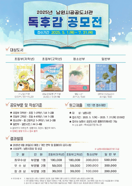 접수기간은 5월 1일부터 7월 31일까지이며, 초등부(저학년), 초등부(고학년), 청소년부, 일반부 네 부문으로 나뉘어 남원시민이면 누구든지 참여할 수 있다.