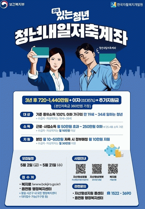 청년내일저축계좌 사업은 일하는 청년이 자산 형성과 자립의 기반을 마련해 사회에 안착할 수 있도록 기회를 주는 복지사업으로 일정 소득 요건을 갖춘 근로 청년이 3년간 매월 10만 원 이상 꾸준히 저축하면, 정부가 소득계층에 따라 월 10~30만 원의 근로소득장려금을 추가 적립해 주는 제도다.