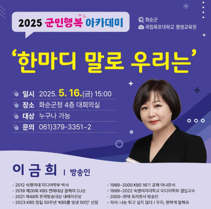 조미화 화순군 인구청년정책과장은 “이번 강연이 군민들에게 따뜻한 위로와 소통의 지혜를 전하는 뜻깊은 시간이 되기를 바란다”라고 전했다.