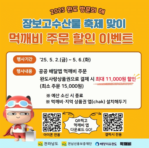 이벤트는 5월 2일부터 6일까지 5일간 진행되며, 공공 배달앱 먹깨비를 통해 음식을 주문 시 완도사랑상품권으로 결제하면 최대 11,000원(최소 주문 15,000원)의 할인 혜택을 제공한다.