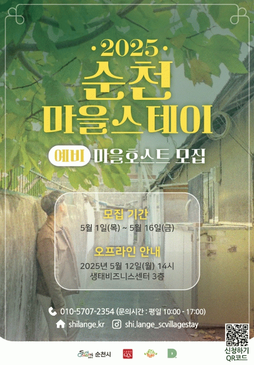 신청은 5월 1일부터 5월 16일 오후 6시까지 이메일, 네이버 설문 또는 방문 접수로 가능하며, 자세한 사항은 순천시청 누리집과 순천마을스테이 공식 누리집에서 확인할 수 있다.