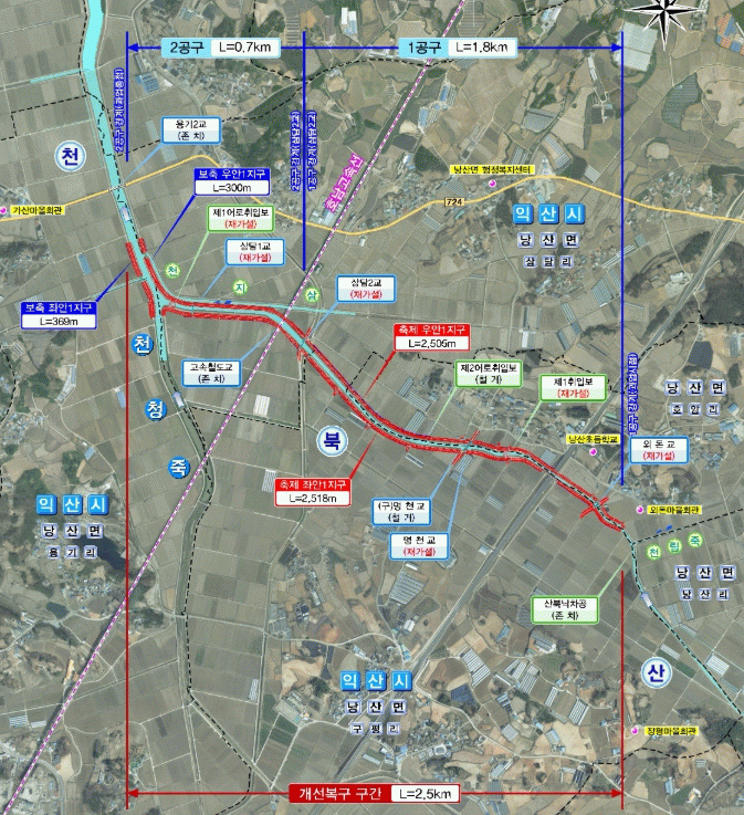 공사 구간은 낭산면 구평리 1760번지에서 삼담리 죽청천 합류점까지 총 2.5km로 △제방 보강(5,796m) △교량 재가설(4개소) △기존 교량 철거(1개소) 등 구조적인 개선이 이뤄질 예정이다.