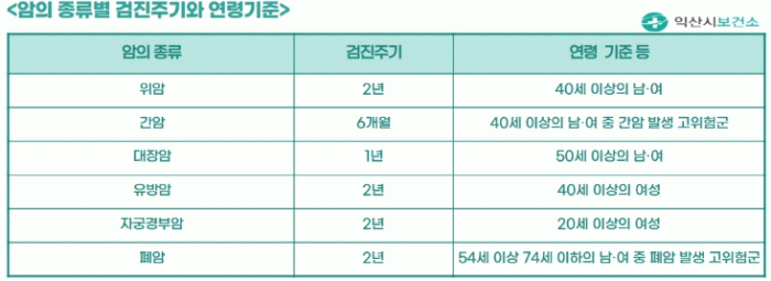 검진 항목은 △위암(40세 이상, 2년 주기) △간암(40세 이상 고위험군, 6개월 주기) △대장암(50세 이상, 1년 주기) △유방암(40세 이상 여성, 2년 주기) △자궁경부암(20세 이상 여성, 2년 주기) △폐암(54~74세 고위험군, 2년 주기) 등 6가지로 구성돼 있다.