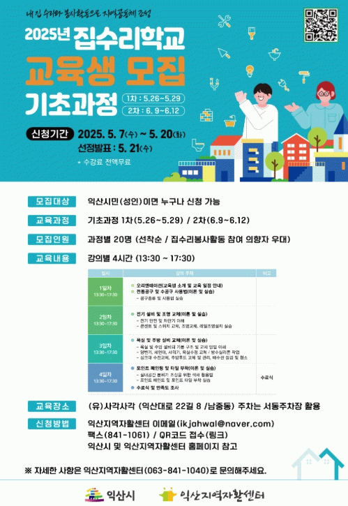 집수리학교는 익산시가 후원하고 익산지역자활센터가 주관하며, 생활 속 불편 사항을 직접 해결할 수 있도록 실용적인 기술을 배우는 프로그램이다.