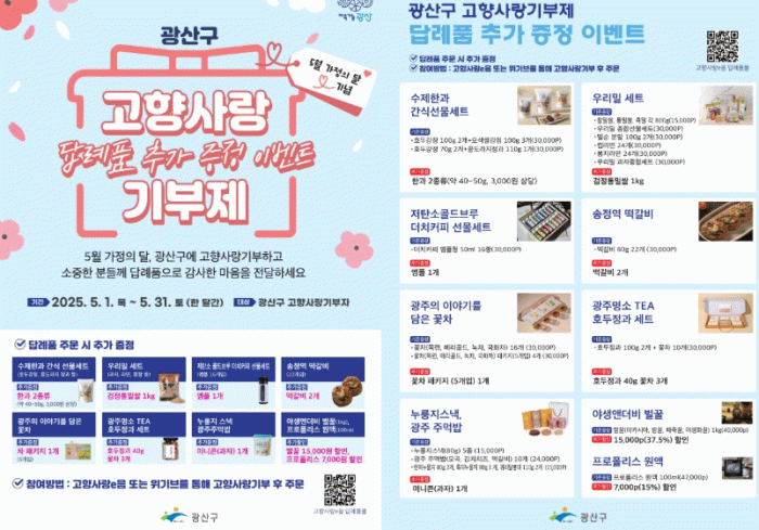광산구는 고향사랑기부자를 대상으로 수제한과, 꽃차, 떡갈비, 더치커피 등 총 18종의 답례품을 선택하면 추가로 하나를 더 증정한다.