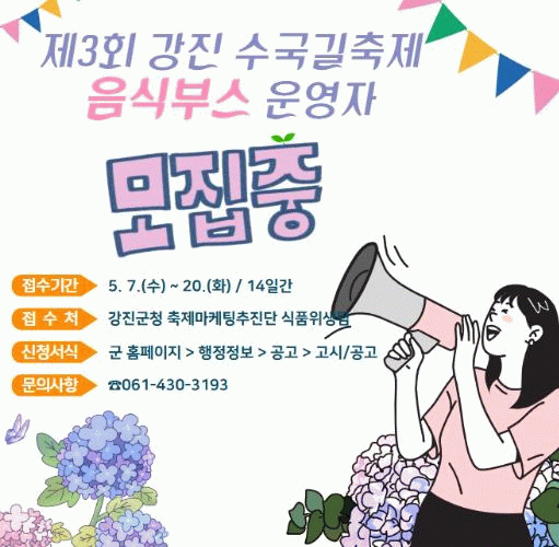 강진군이 오는 6월 27일부터 29일까지 3일간 강진읍 보은산 V랜드 공원 일원에서 펼쳐질 제3회 강진 수국길축제를 더욱 특별하게 만들기 위해 강진의 신선한 재료를 활용한 여름 메뉴와 특산물을 선보일 열정적인 음식부스 운영자를 모집한다.