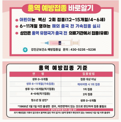 강진군 보건소는 과거 접종력이 없는 생후 12개월 이상은 예방접종이 필요하며, 해외여행 전에는 출국 최소 2주 전까지 접종을 완료해 항체형성 기간을 충분히 확보할 것을 권고하고 있다.
