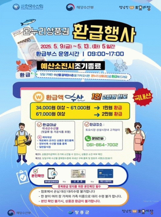 온누리상품권 환급은 참여 점포에서 국내산 수산물을 구매후 영수증을 지참하고 환급장소인 상설시장 내 고객쉼터를 방문하면 환급 받을수 있다.