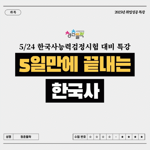 한국사 수업은 5월 24일 한국사능력검정시험을 대비한 특강으로 한국사의 주요 시대별 내용을 중심으로 집중·학습하고, 기출문제를 풀어가며 핵심 사항을 점검한다. 수업 일시는 5월 15일, 16일, 21일부터 23일까지 오후 7시까지 총 5회차로 진행된다.