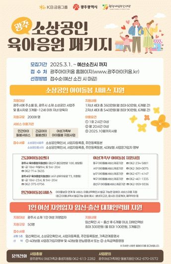 광주광역시는 KB금융그룹의 후원(사업비 10억원)으로 3개월~12세 자녀를 둔 지역 소상공인(사업주 및 종사자)에게 아이돌봄서비스 이용료를, 1인 여성 자영업자에게는 임신‧출산 대체인력비를 지원하는 ‘광주 소상공인 육아응원패키지 지원사업’을 지난해 12월부터 시행하고 있다.