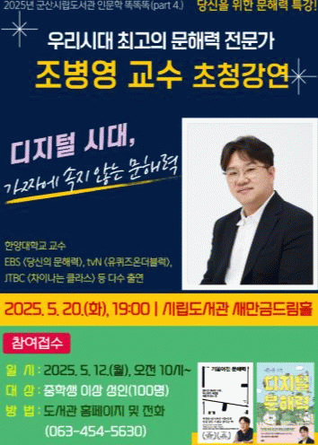이에 발맞추어 군산시립도서관은 5월 20일 오후 7시 조병영 교수를 모시고, '디지털 시대, 가짜에 속지 않는 문해력'이라는 주제로 특별 강연을 개최한다.