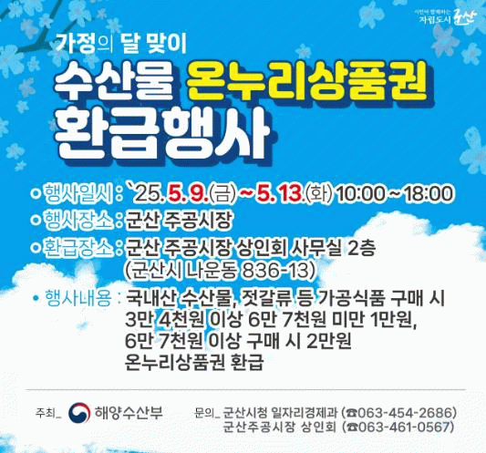 군산시 이헌현 일자리경제과장은 “이번 행사가 가정의 달을 맞아 시민 여러분께 실질적인 혜택을 드리고, 지역 상권에도 활기를 불어넣는 계기가 되길 바란다. 앞으로도 지역경제 활성화를 위한 다양한 노력을 이어가겠다.”라고 말했다.