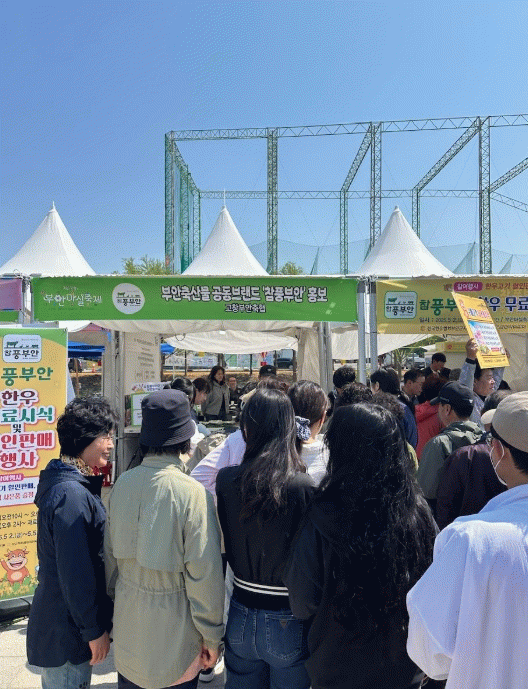 이번 축제 기간 동안 부안군은 ‘참풍부안’ 브랜드 홍보 부스를 운영하고 관람객을 대상으로 한우·오리 무료 시식회를 진행해 큰 호응을 얻었다.