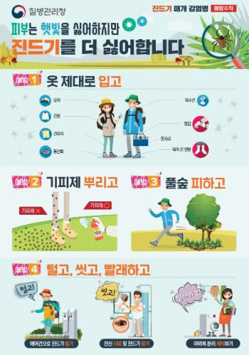 진드기 매개 감염병은 백신이 없어 예방수칙 준수가 가장 효과적인 예방법으로 알려져 있다. 군 보건소는 주민들에게 △풀밭에 눕거나 앉지 않기 △피부 노출 최소화(팔토시, 장갑, 모자 착용) △야외활동 후 세탁과 목욕 철저 등을 당부하고 있다.