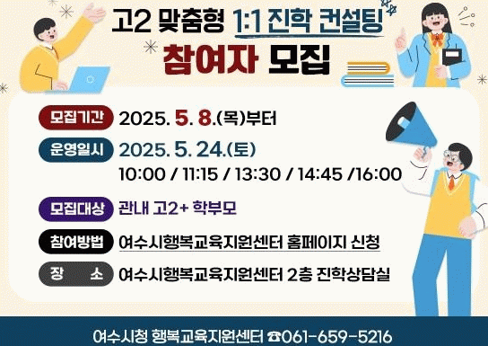 한편, 여수시행복교육지원센터에서는 최신 교육 추세를 반영해 ▲학년별 시기별 대입 진학 컨설팅 ▲대학생 선배 멘토링 ▲계열별 입시설명회 ▲학생부 및 공부법 특강 ▲고교학점제 특강 ▲대학 탐방 캠프 등 다양한 프로그램을 운영하고 있다.