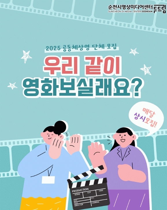 참여대상은 관내 15명 이상으로 구성된 단체 및 모임을 대상으로 관람 예정일 전달 20일까지 순천시영상미디어센터 누리집(을 통해 신청 가능하다.