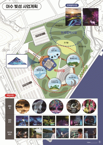 세부적으로는 △여수를 대표하는 섬을 영상조명으로 표현한 ‘테마 섬’ △섬별 특색을 연출한 테마 로드 ‘여수 빛섬길’ △프로젝션 맵핑, 몰입형 영상, 인터렉티브 체험시설 등 디지털 기술을 활용한 참여형 콘텐츠 ‘미디어바다’ 등이 있다.