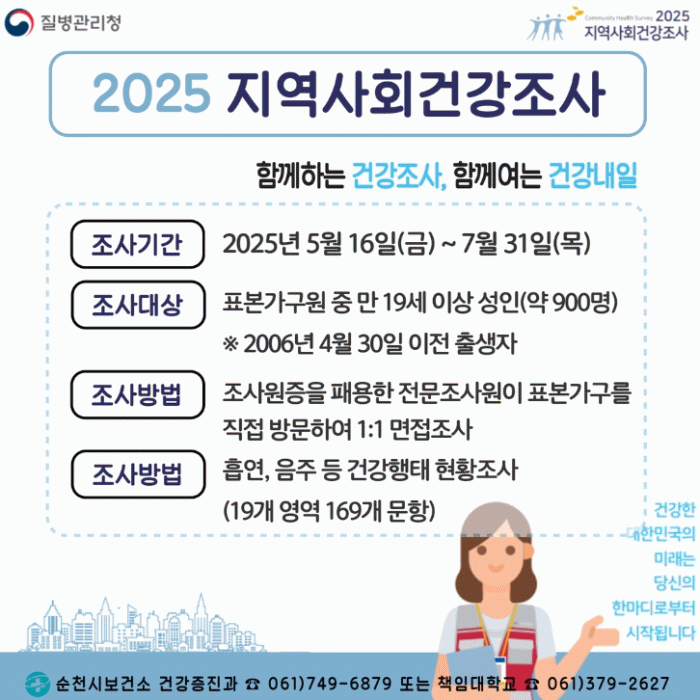 시 보건소 관계자는 “본 조사를 통해 수집된 통계자료는 순천시 보건사업의 계획 수립, 평가 등을 위해 활용되는 중요한 자료인 만큼 선정 가구는 지역 주민의 건강 향상을 위해 조사원 방문 시 조사가 원활히 진행될 수 있도록 적극적인 참여와 협조를 부탁드린다”고 말했다.