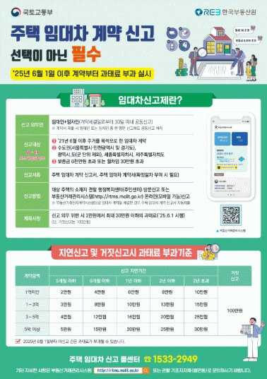 시는 오는 6월부터 계도기간이 종료돼 과태료 부과가 시행되는 만큼 6월 1일 계약분부터 기간 내(계약체결일로부터 30일 이내) 신고 의무를 이행하지 아니한 임대인·임차인에게 각각 계약 금액과 해태 기간에 따라 최소 2만 원에서 최대 30만 원까지의 과태료를 부과할 계획이다. 또, 허위신고의 경우에는 100만 원의 과태료가 부과된다.