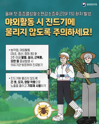 이를 위해 ▲야외활동 시 긴 소매, 긴 바지 착용, ▲진드기 기피제 사용, ▲귀가 후 즉시 샤워 및 옷 갈아입기 등 개인 예방수칙 준수가 중요하다.