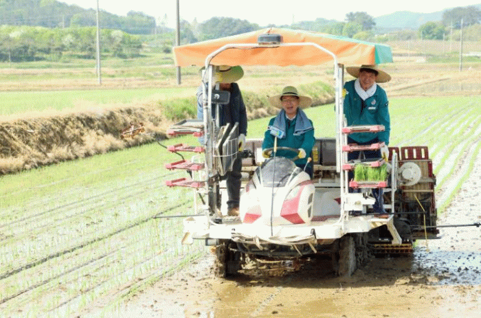 심덕섭 고창군수와 조민규 고창군의회 군의장과 군의원들은 8일 오전 신림면 송용리 모내기 현장을 찾아 직접 이앙기에 올라 모내기를 실시했다.