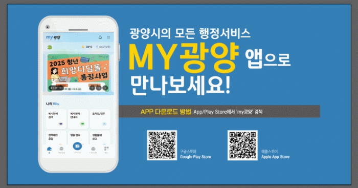 MY광양’ 앱은 현재 시범운영 중(2025. 4. 22. ~ 5. 21.)이며, 구글 플레이스토어와 애플 앱스토어에서 내려받을 수 있다.